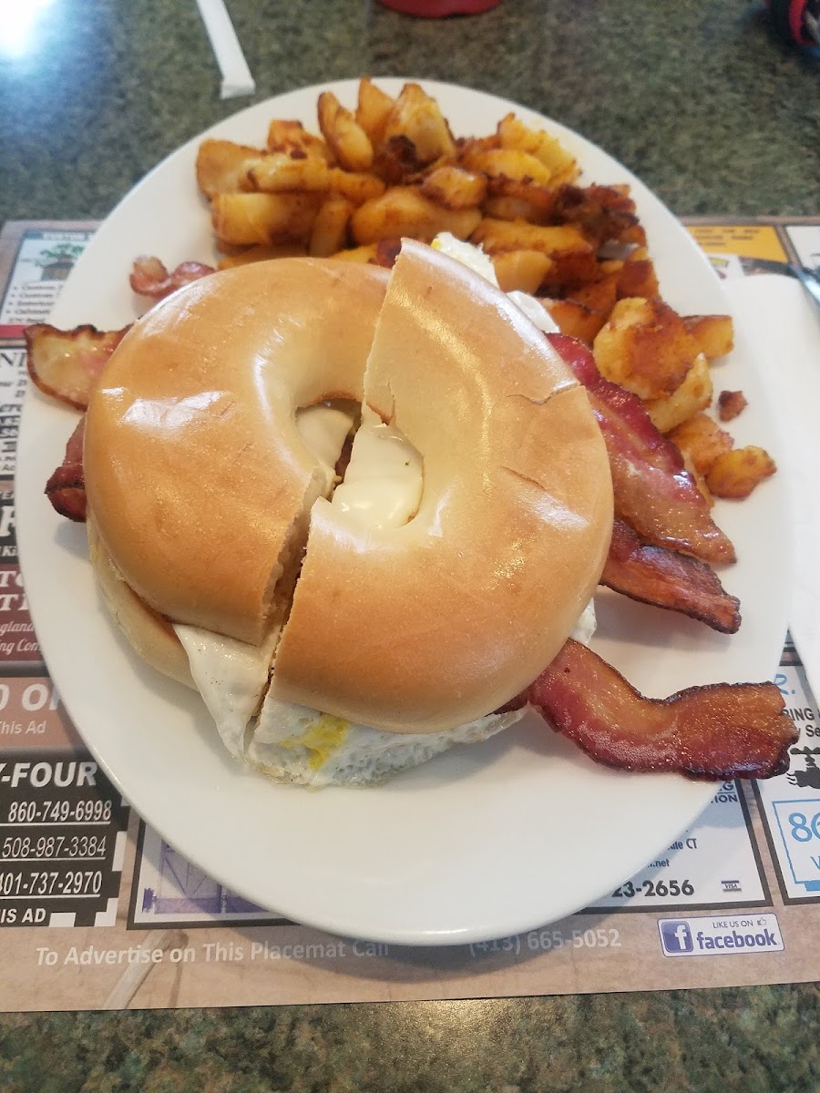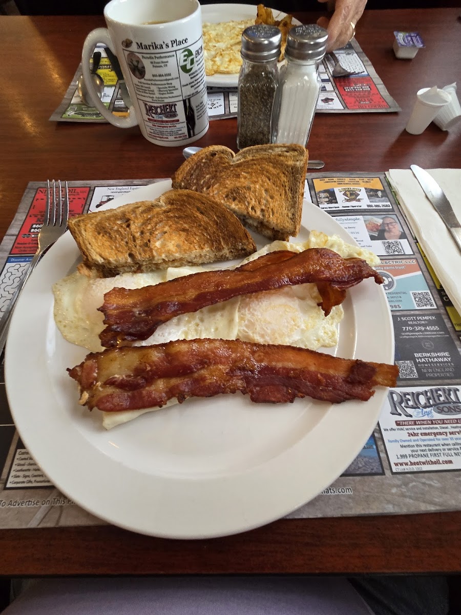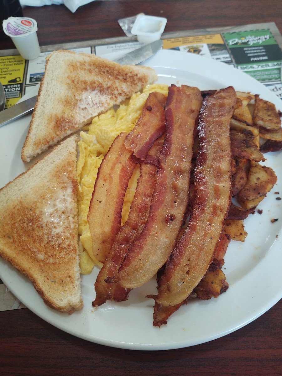 I love breakfast and rarely able to go so I got the Hungry man with an extra side of bacon! Bacon was cooked perfectly, the waitresses team up to get everyone serviced. They were busy only delay was getting our check and even stacked everything at the end of the table.