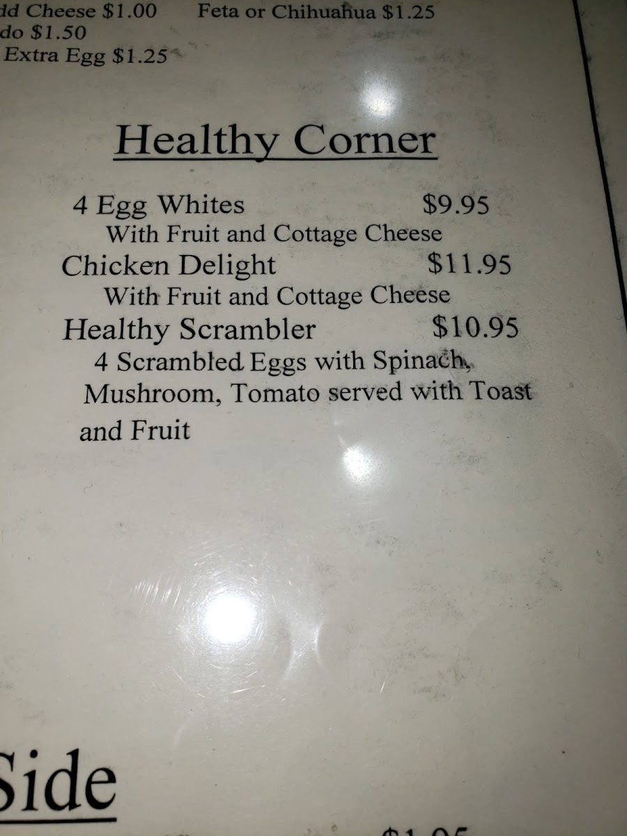 Chicken, cheddar and broccoli scrambled with egg whites. Served with fruit and whole wheat toast.