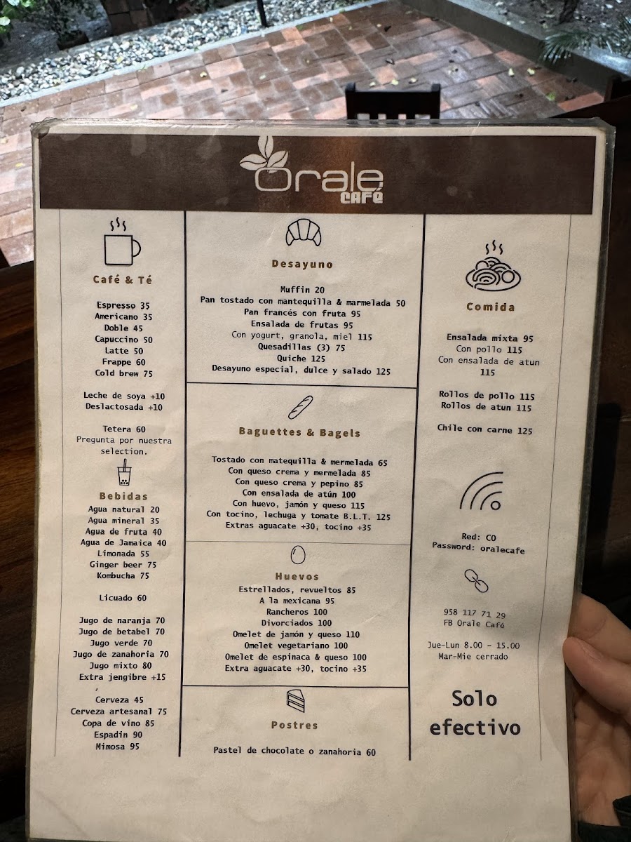 Orale Café is a Breakfast Restaurant located at C. las Casitas, Playa Zipolite, 70947 Arroyo tres, Oax., Mexico. It has received 635 user reviews. The featured dishes include Breakfast Plate, Huevos Rancheros, Pan Francés, Café Americano, and Jugo Verde, emphasizing morning meal options and beverages.