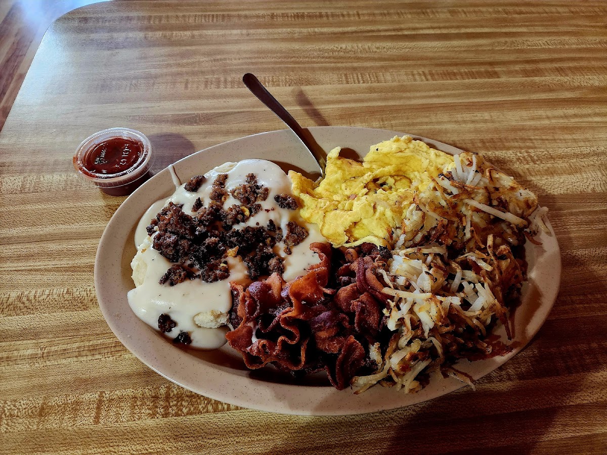 Great customer service. For what you get it's really cheap for a heaping plate. Eggs, bacon, hashbrowns, biscuits and sausage gravy for 6.75.