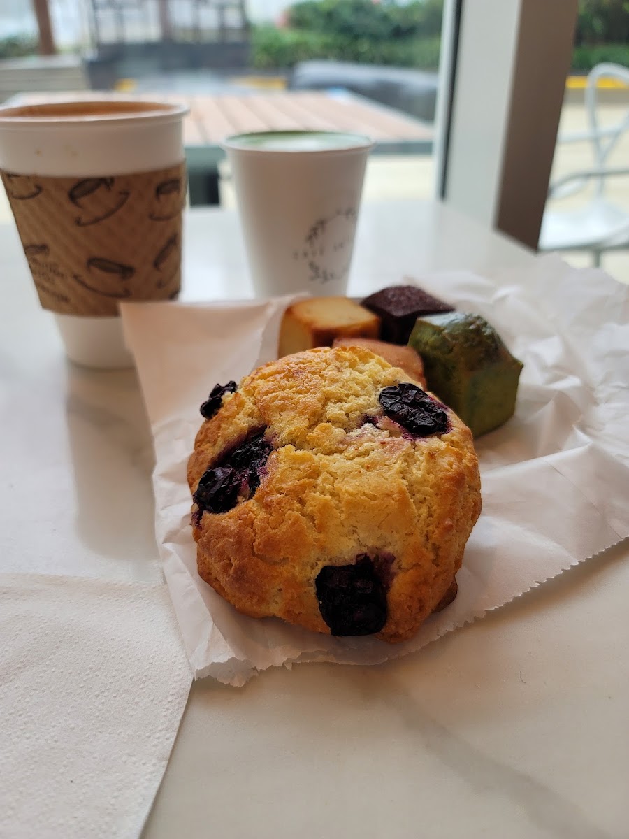 Got an iced vanilla latte with a blueberry scone. The scone is pretty good, it’s not super sweet and has a nice crispy exterior but soft inside. Iced vanilla latte is good, the espresso has a good flavor profile too it, but was slightly too sweet from the vanilla. Overall, pretty good!