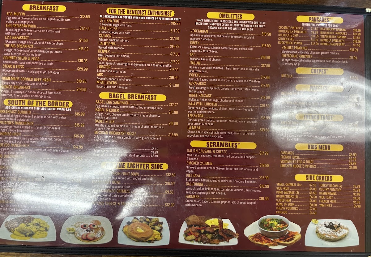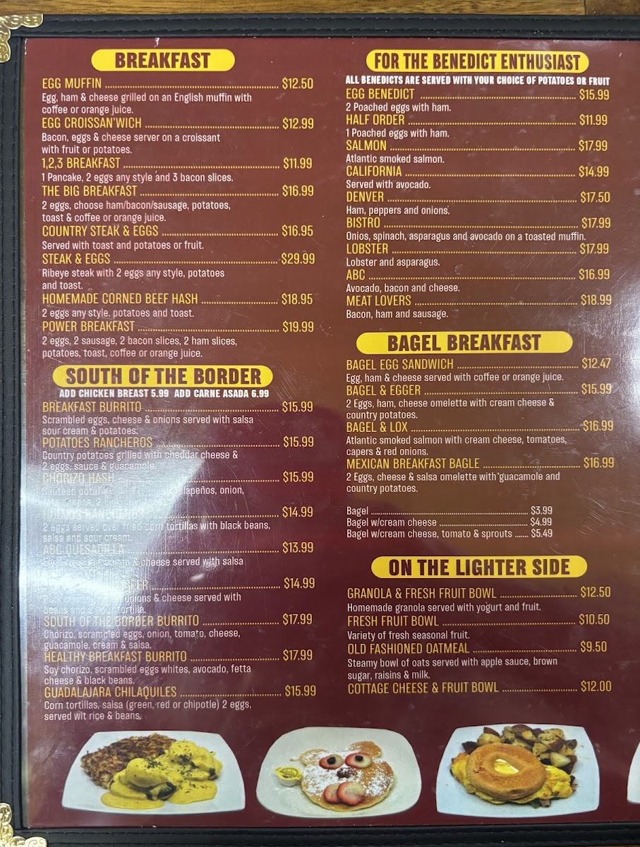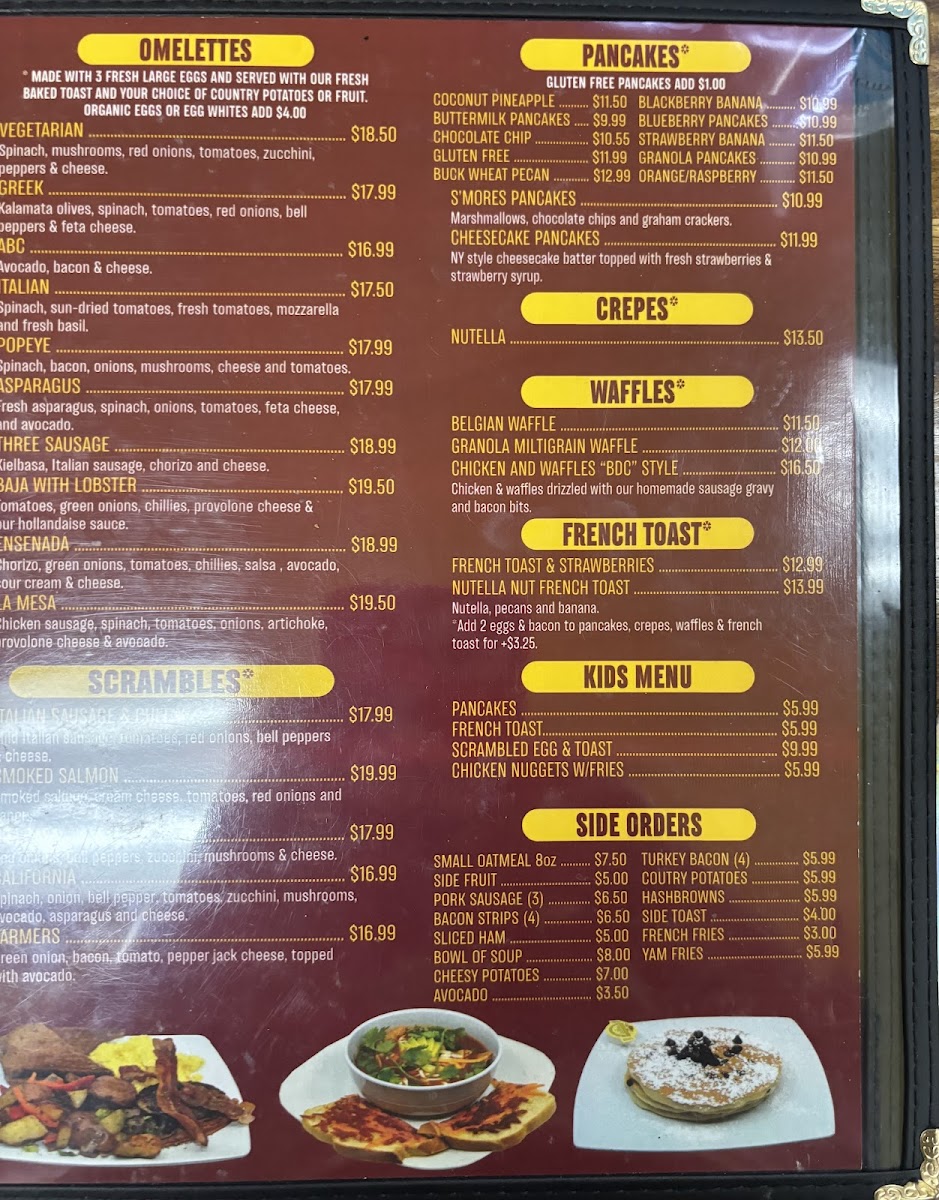 Tomatoes, green onions, chilies, provolone cheese and hollandaise sauce. Made with three fresh large eggs and served with fresh baked toast and choice of country potatoes or fruit.