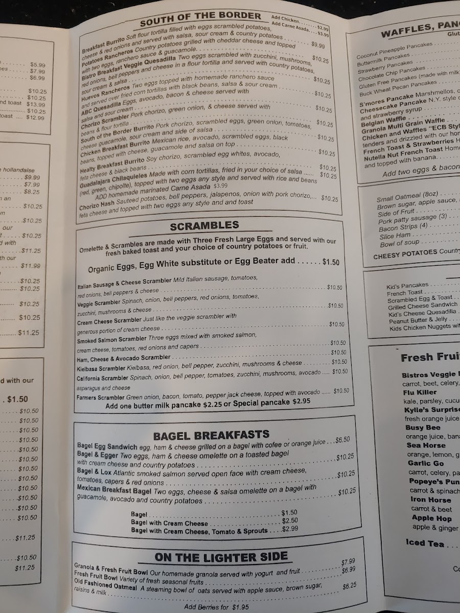 Chorizo, green onions, tomatoes, chilies, salsa, avocado, sour cream, and cheese. Made with three fresh large eggs. Served with fresh baked toast and choice of country potatoes or fruit.