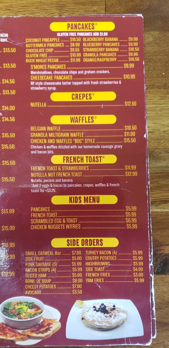 Kalamata olives, spinach, tomatoes, red onions, bell peppers, and feta cheese. Made with three fresh large eggs and served with fresh baked toast and choice of country potatoes or fruit.
