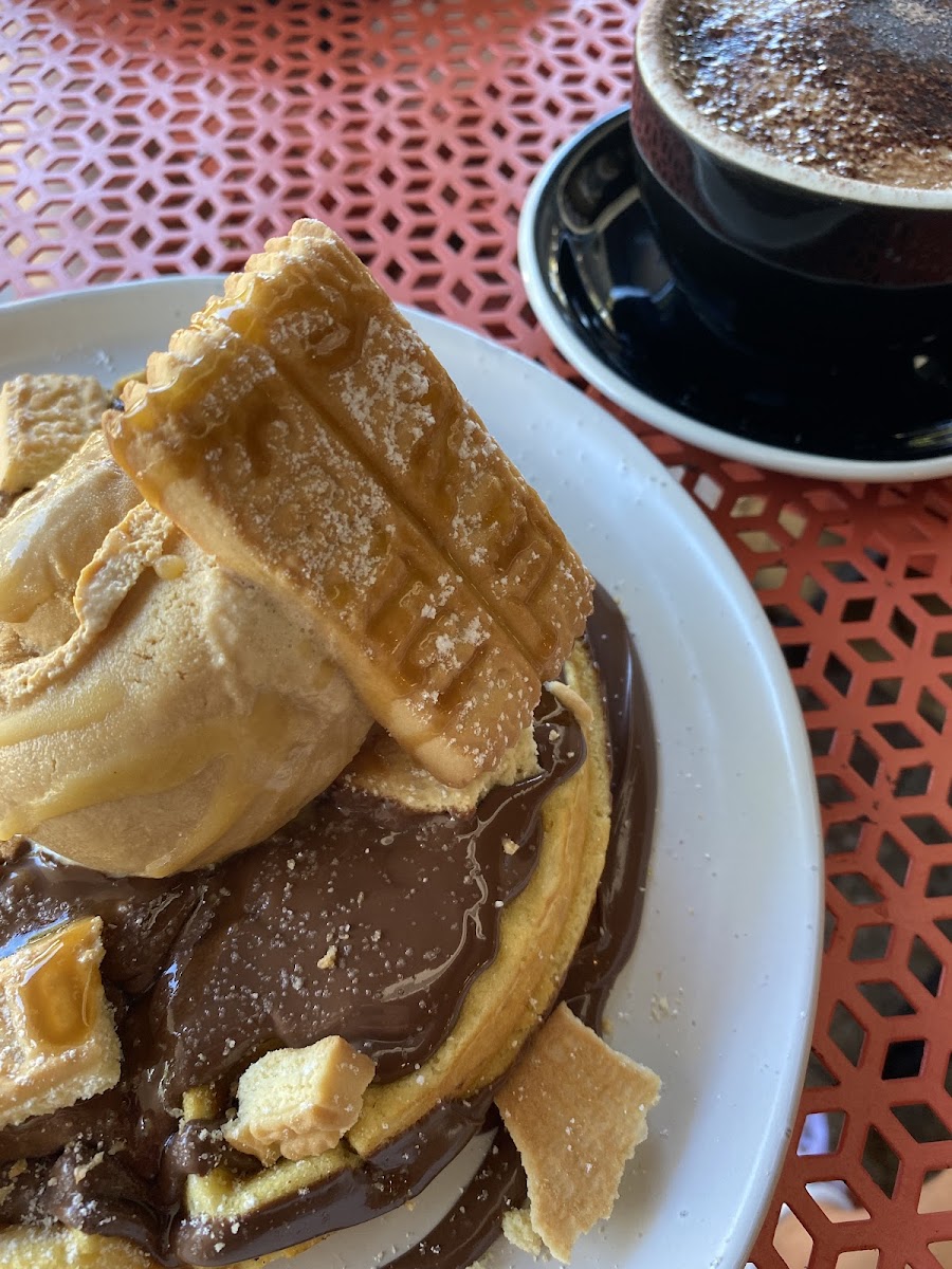A nice little café in the centre of town, and one of the few places open on a Sunday. Pod serves fairly classic brunch food, as well as a range of sweet treats (mostly waffles), so there's something for everyone. The food was pretty cheap but tasted great, so we were really impressed. Only downside is that there was no kids menu, so we had to order adult meals for them. Coffees were good. Nothing special in terms of flavour, but well made and good latte art. The hot Nutella was also delicious! And kids milkshakes were very reasonably priced. Staff were friendly, highchairs were available, there was indoor and covered outdoor seating, and parking was right outside on the street.