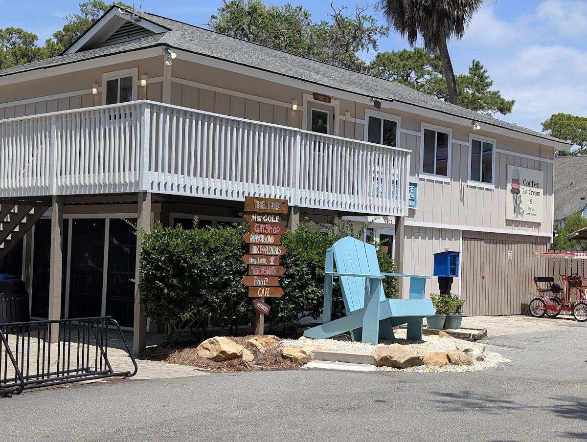 Within OceanRidge, small Cafe with Coffee, Alcohol and goods. There is no freshly prepared food during the off-season. There is take and bake food. They had a variety of smaller items that could be purchased; ornaments and tourist type goods. Close to the main recreational pool, mini-golf, and a playground. Clean restrooms in the area. Walking distance from many residential units. The staff was very friendly. Ample parking, a few spots out front.
