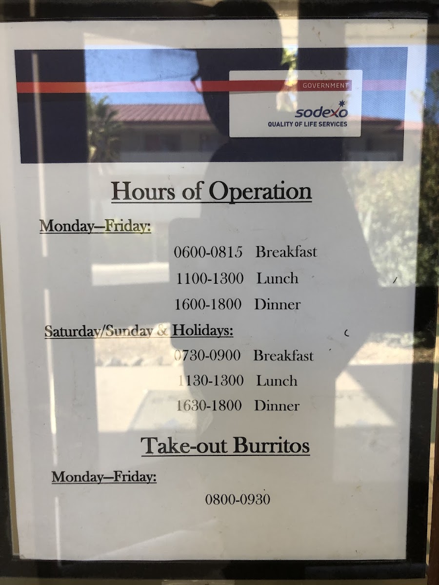 Been here for over a year and the food has been terrible and just got back from deployment for it not to be any better and for them to give you less food and no way to get more unless you pay for it might as well buy and cook your own meals. (UPDATE!!) new facility has been open as of December 23 food quality has been getting better as well as portions are fair new facility is much more vibrant and welcoming rather than the almost gloomy atmosphere of the old facility only thing I believe could improve further is efficiency.
