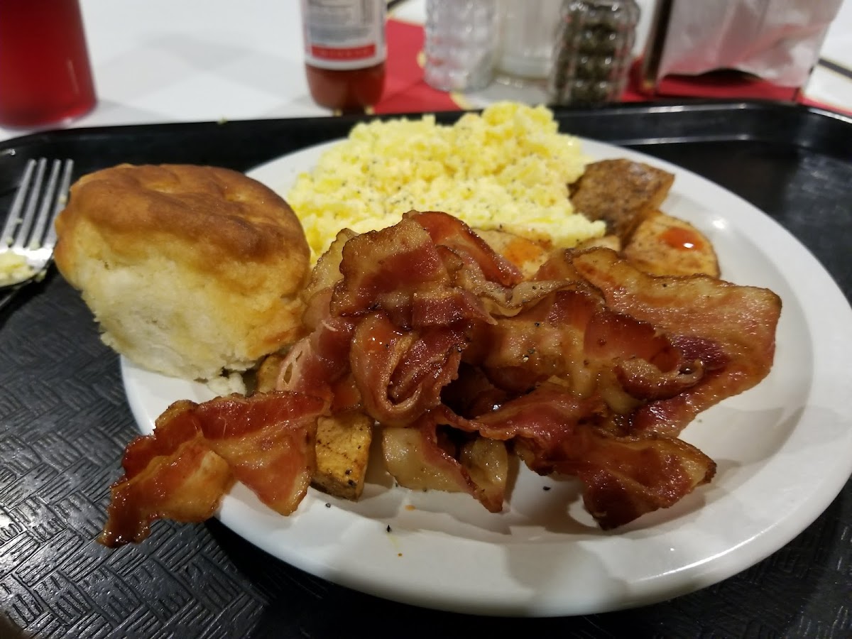 I have good experiences here. The food is decent for a DFAC. People have mentioned undercooked food, I never have that but individual experience may vary. The line moves pretty quickly. The soldiers that work there are usually polite. The facility is in decent shape and is usually clean. They have table outside that you can sit at if you choose to. The bathrooms are also usually clean.