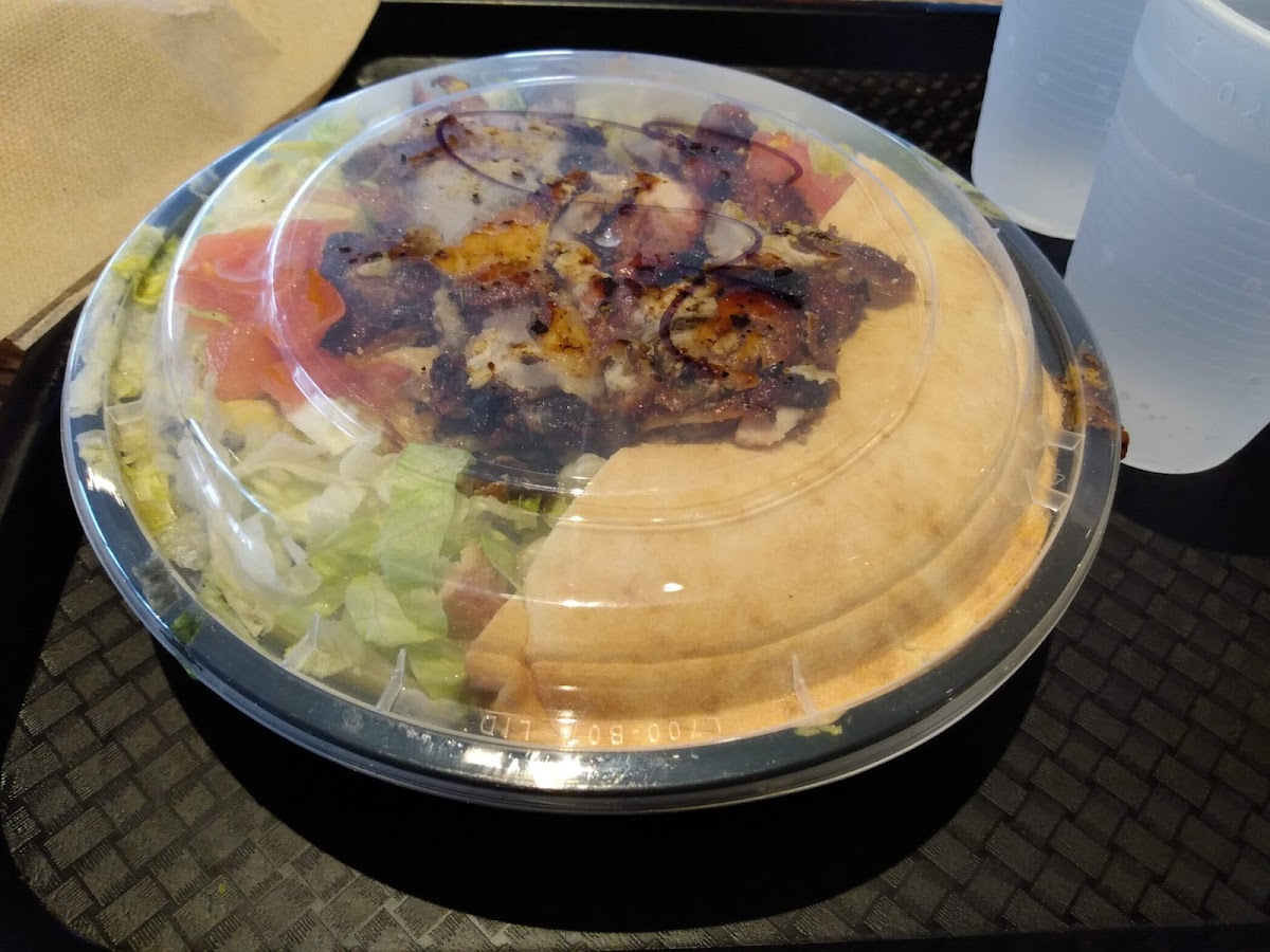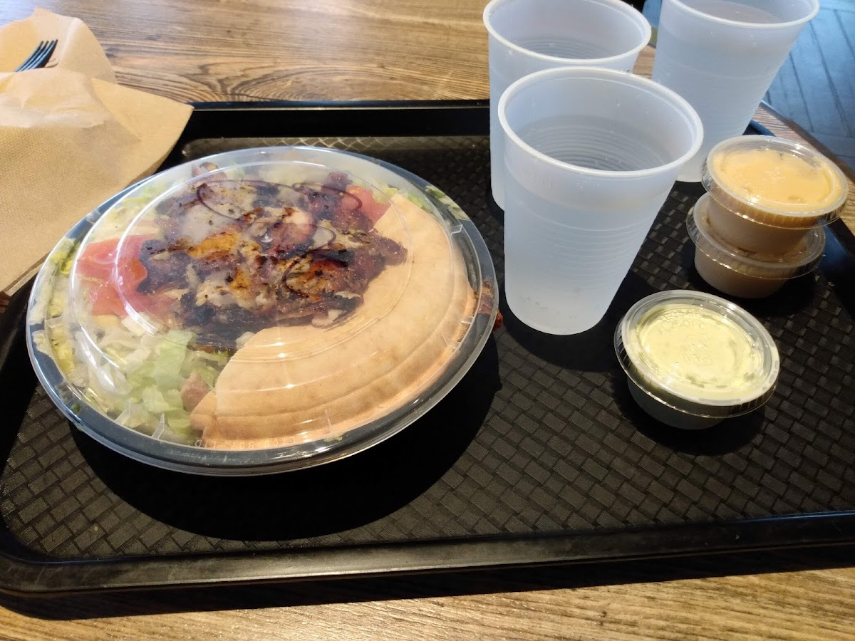 Expect a little less than ten bucks per person for the traditional platter. Casual fast food likely a little more healthy than McDonald's. Large portions! Usually enough for me and I get a takeout bag to share with a homeless or otherwise less fortunate person. They will give you a bag, grab a few extra napkins and a fork and knife to share. The platters I normally buy are a rice base, lettuce, tomato, and chicken breast. There are other platter options some include beans, some avocado, some cheese. All are great but they can get too expensive in my opinion. There are also other options. A colleague of mine often gets a baked potato with toppings, it is a couple of bucks. Try the pink vinegar, I enjoy that the most!