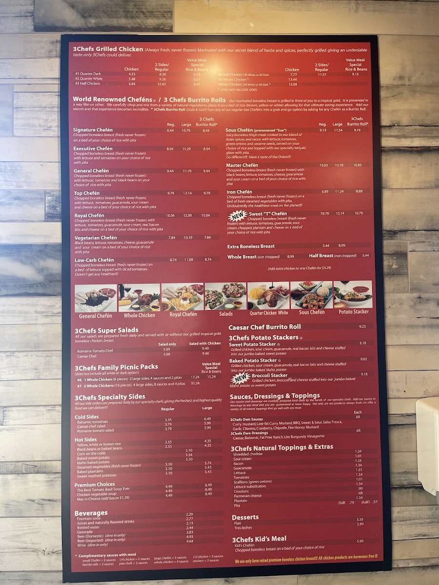Chopped boneless breast (fresh never frozen) with lettuce, tomatoes, and black beans on a bed of your choice of rice with pita.