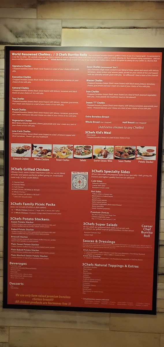 Chopped boneless breast (fresh never frozen) with lettuce, tomatoes, guacamole, sour cream, real bacon bits, and cheese on a bed of your choice of rice with pita.