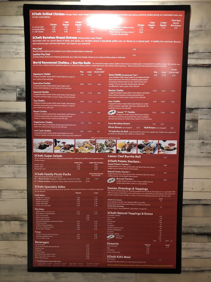 Half chicken, half all dark or half all white, marinated with herbs and spices. Includes 2 regular sides, a full pita, and 2 sauces
