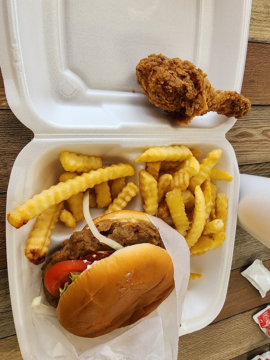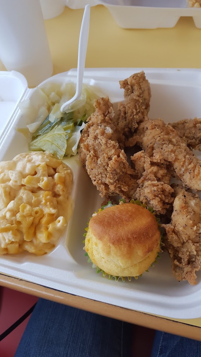 Excellent fried chicken, mashed potatoes and gravy and dinner rolls. The green beans came from a can. Very friendly staff and can't beat the price. Two piece dark meat plate with two sides, a roll, and drink for 9$