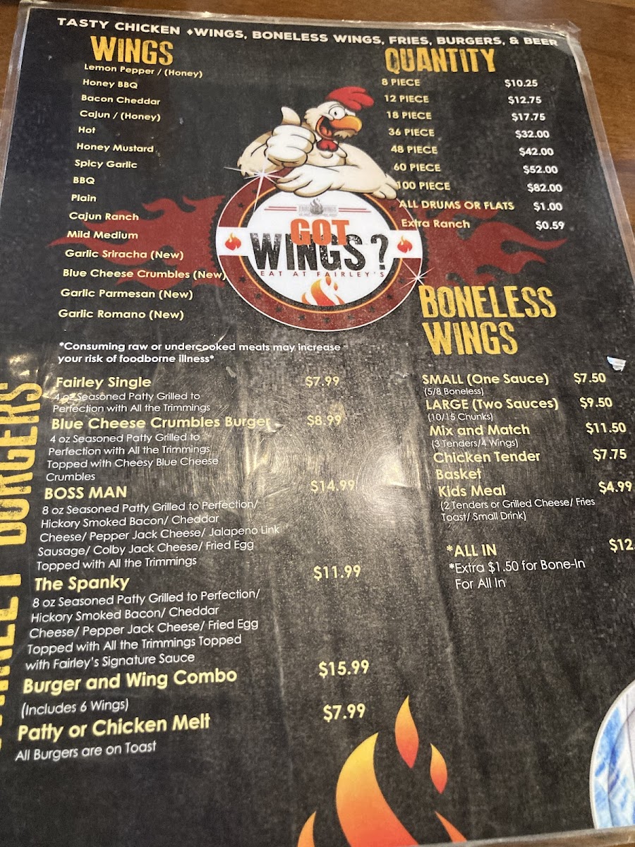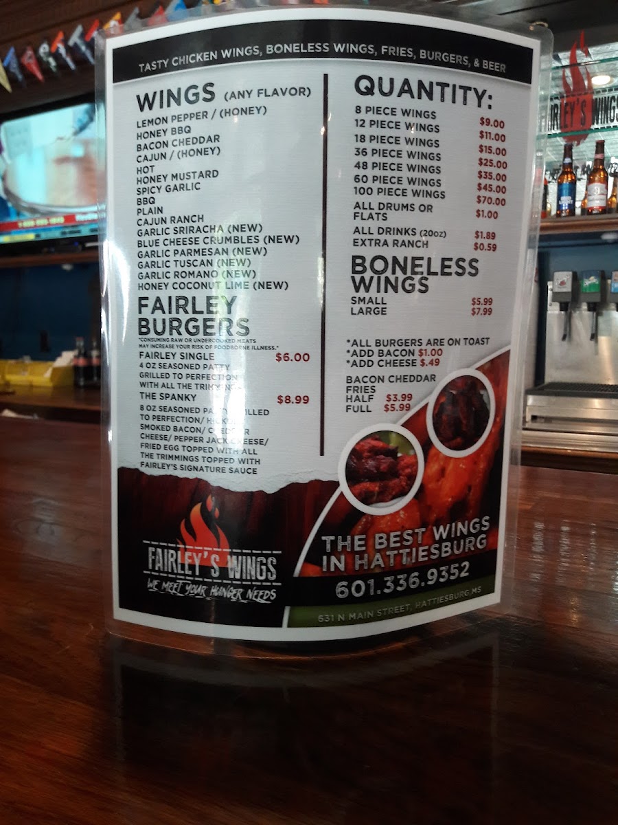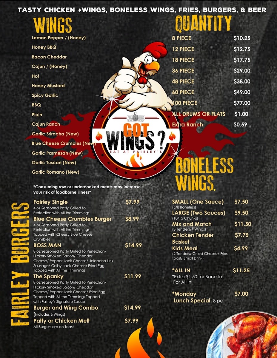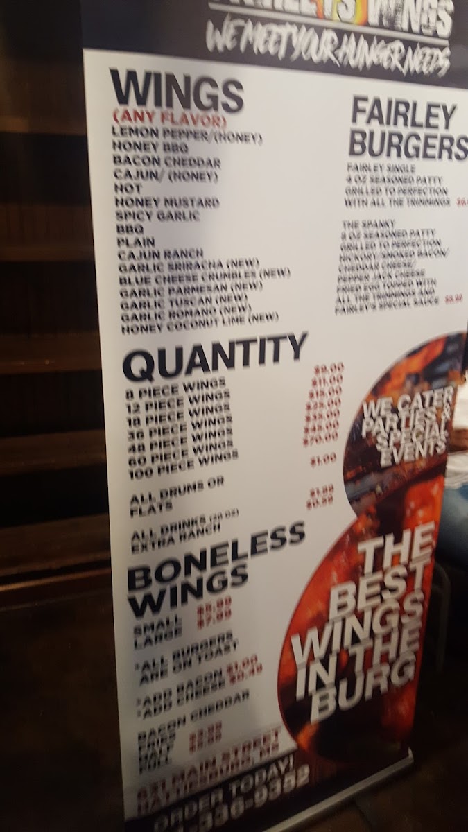 A fairley single burger and 6 wings with your choice of flavor. Add-ons for an additional charge.