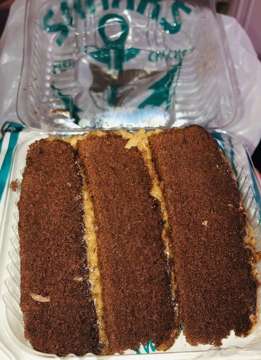 Chicken was good and seasoned well. Food remained warm from pick up to arriving home. Would definitely purchase from Sharks again. In addition, stays open late.