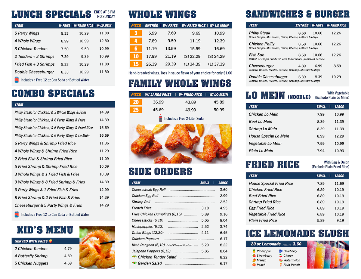 C14. Philly Steak Or Chicken, 6 Pieces Party Wings & Fried Rice Combo