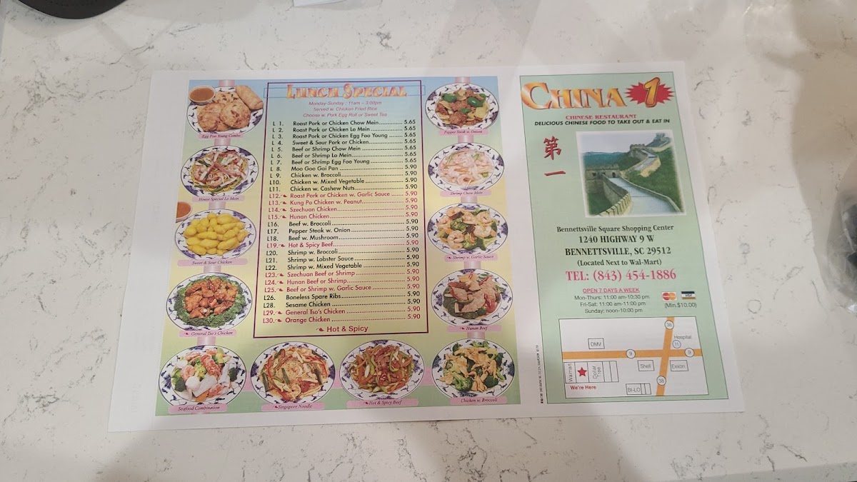 I ordered the Shrimp Lo Mein with Chicken Wing Combo. It was Dee Lish! China 1 is a cook to order restaurant so the food is hot whether ordering online, over the phone, or in person. I ordered in person. I found the restaurant clean and the customer service good. A combo can also be ordered with chicken fried rice or shrimp fried rice and a pork roll. It's worth a visit.