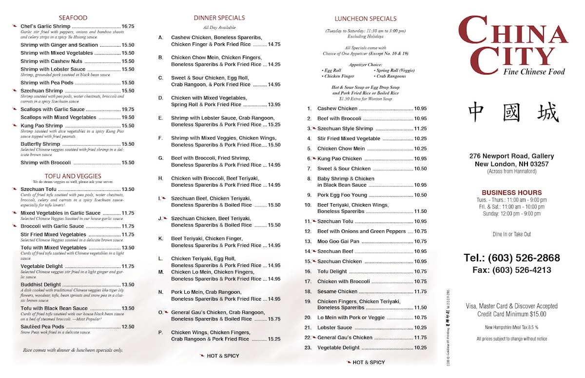 China City is a Chinese restaurant located at 276 Newport Rd, New London, NH 03257, United States. It has received 220 reviews from customers. The restaurant experiences no wait times on Monday, Thursday, Friday, Saturday, and Sunday, but on Wednesday, there can be a peak wait of up to 15 minutes from 12:30 PM to 5:00 PM. Their featured dish is Sesame Chicken, a popular choice among diners looking for a flavorful and classic Chinese entrée. The restaurant's menu reflects traditional Chinese cuisine, providing a variety of options to satisfy different tastes.