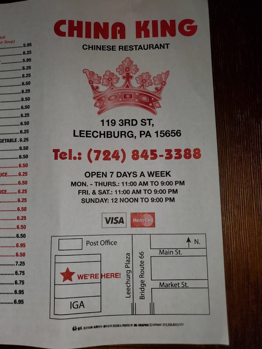 China King is situated at 119 3rd St, Leechburg, PA 15656, United States. As a Chinese Restaurant, it has 68 user reviews. Their featured dishes include Four Seasons, Triple Delight, Boneless Ribs, Sesame Beef or Orange Beef, and Orange Chicken or Sesame Chicken, showcasing classic Chinese dining options.
