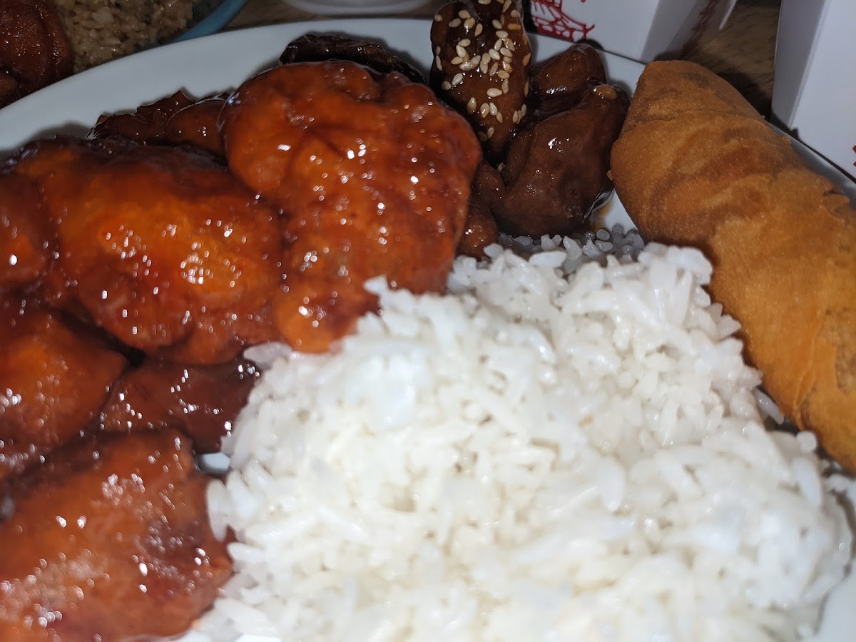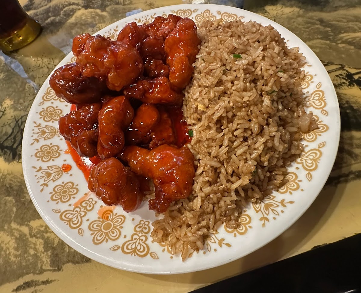 I got the orange chicken off the lunch menu, and it was delicious. The rice had shrimp mixed in and was the best rice I've had at a Chinese restaurant in Louisiana. The orange chicken was cooked perfectly and sweet. The exterior of the restaurant was a mix of drab and decorated. The interior was really cool, with gold and red ceiling tiles showing the phoenix and dragon yin-yang, wood accents, carved pressed-wood dividers between booths, and more details.