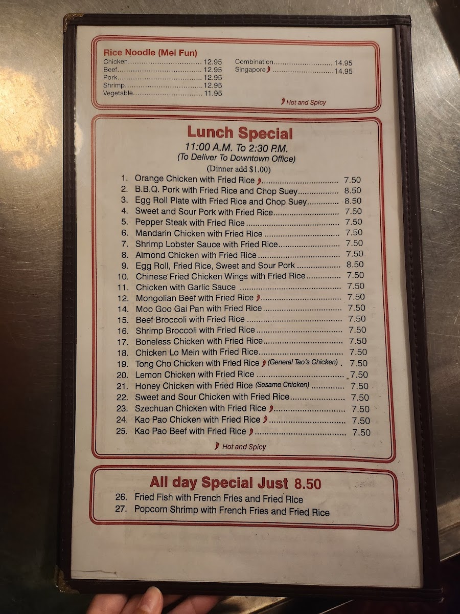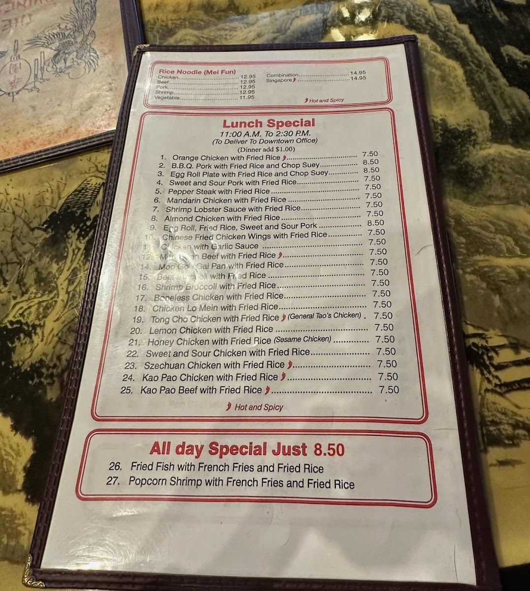 Egg drop soup or hot and sour soup, egg roll, mandarin chicken, shrimp fried rice, fortune cookie and tea.