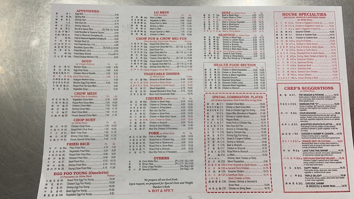 combining various find food into one dish, such as lobster meat, chicken, jumbo shrimp and center cut roast pork with fresh vegetables delightfully flavored with our special seasoning