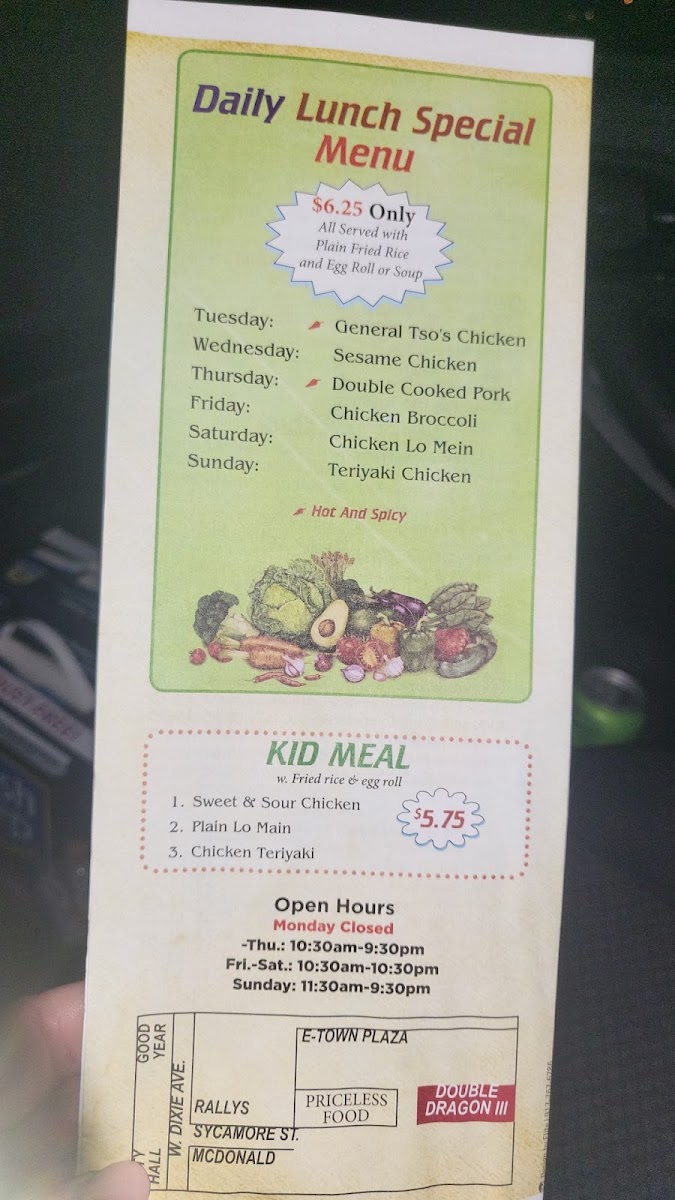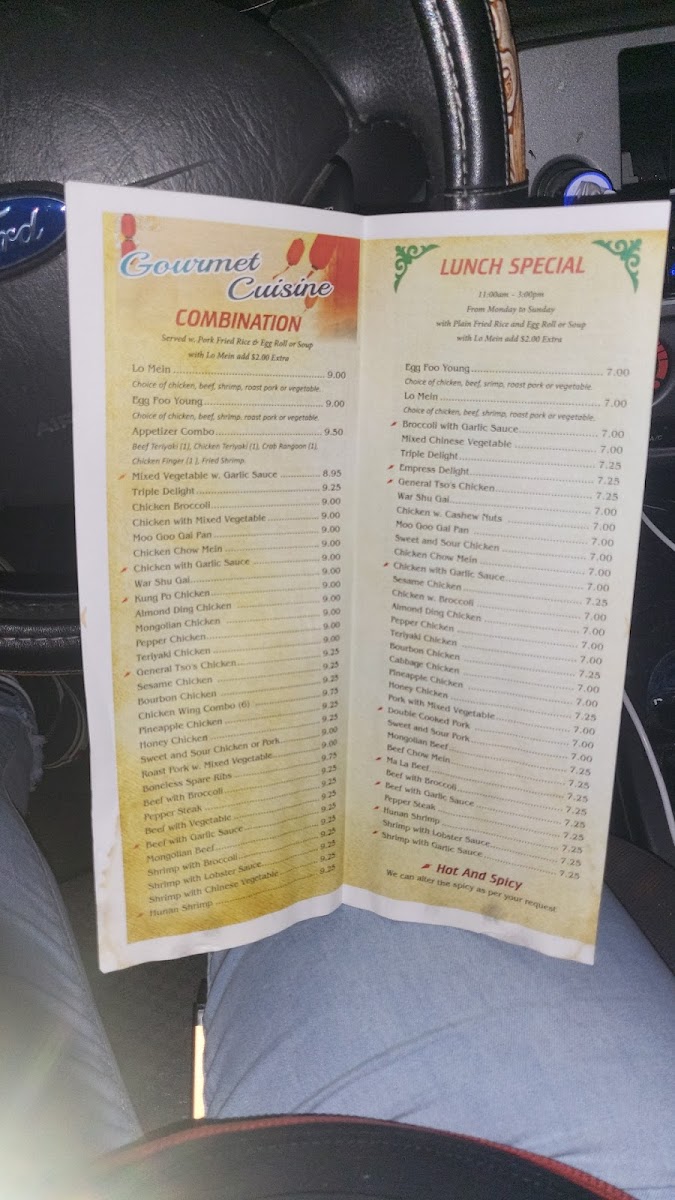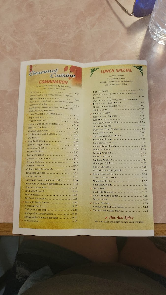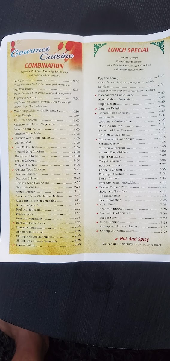 Spicy. Chicken, shrimp, beef, scallop, sliced roast pork, corn, water chestnut, mushroom, green pepper, celery and broccoli.