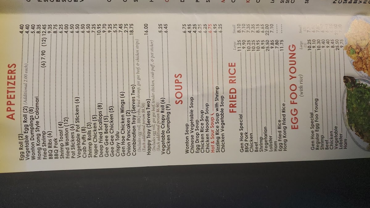 includes egg roll, gee gee beef, paper chicken, crab puffs, and pot stickers.