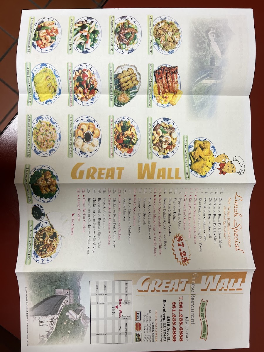 I live 40 miles west, and this is pretty much the closest Chinese food for me. I like Great Wall. You get to see the food being prepared right behind the counter (so you know it's freshly fried), and the ladies are always friendly. I think the stand-out is the portion size for the price. It is generous (by today's standards). Many places have DEFINITELY reduced what they give you to pad the bottom line, but not so at Great Wall. $50 gets you a HEAVY bag of food. And the food is good. I have never had any problems. Well, one thing I wish they would do is to dismantle the TRULY AWFUL relic of 2020 -- a tall plastic partition with a TINY access hole at the payment counter. It's both an eyesore, and makes the entire transaction unpleasant. Let's hope they get rid of it . . . SOON! In the meantime, just "walk around the side" and talk to the lady face-to-face so you can hear each other! But that's my only gripe. They are very good at getting orders correct, and the food is always hot and appetizing (well, not quite so hot after driving home 40 miles, but that is my own making of a problem) :-) All around a 4.5 out of 5.