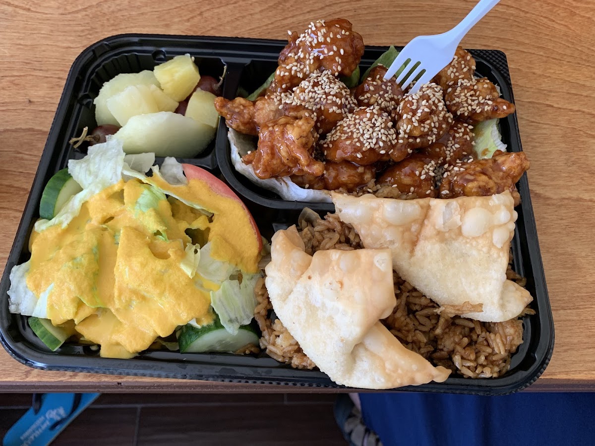 Best chinese around! For $13 at dinner time you get a great size General Tso's chicken meal that isn't an overload of rice but still a good amount. Good amount of chicken l, as well as fresh fruit and salad. Well worth the price.