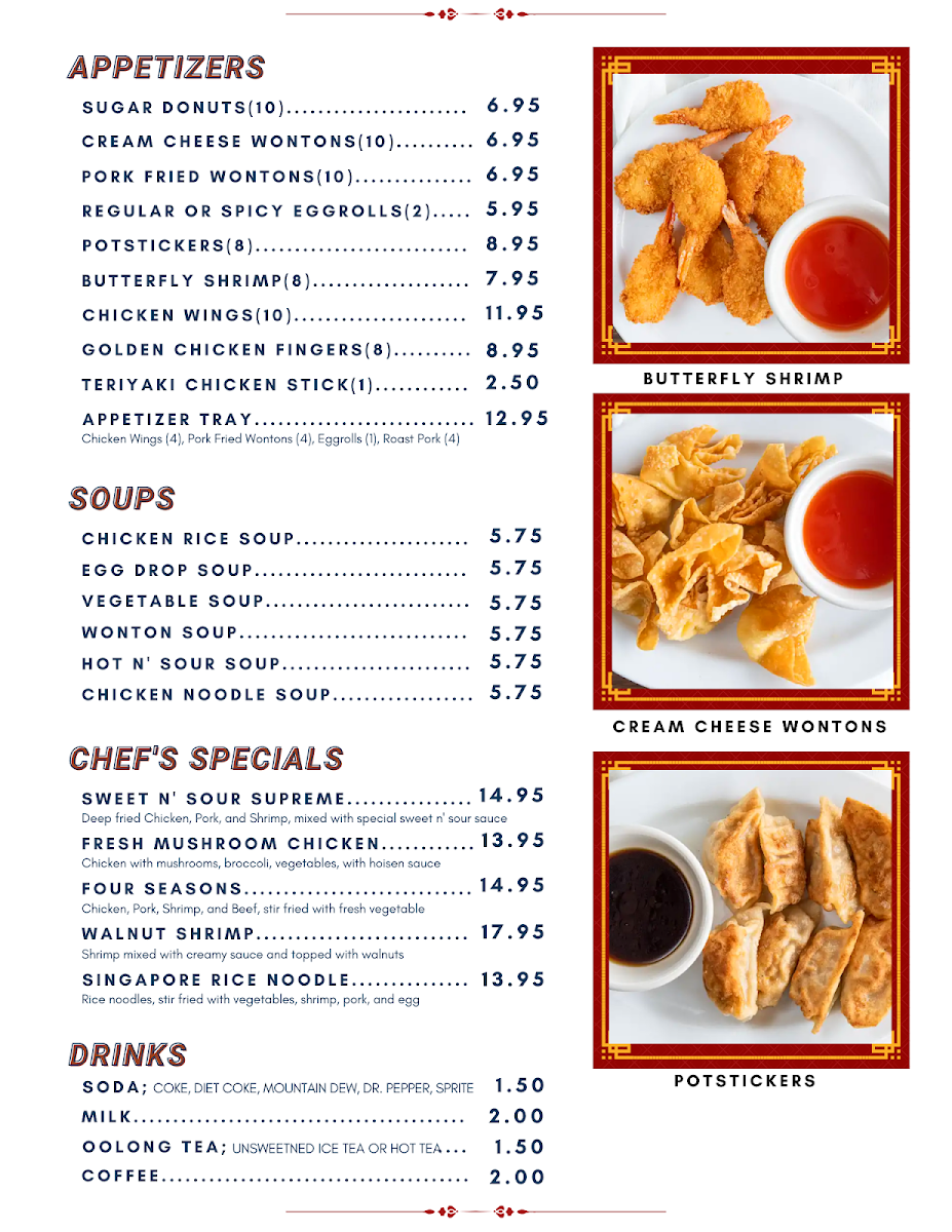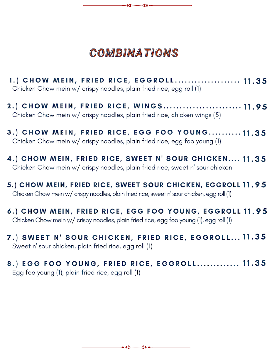 Comes with (4) Chicken wings, (1) egg roll, (4) pork fried wonton, (4) roast pork slices