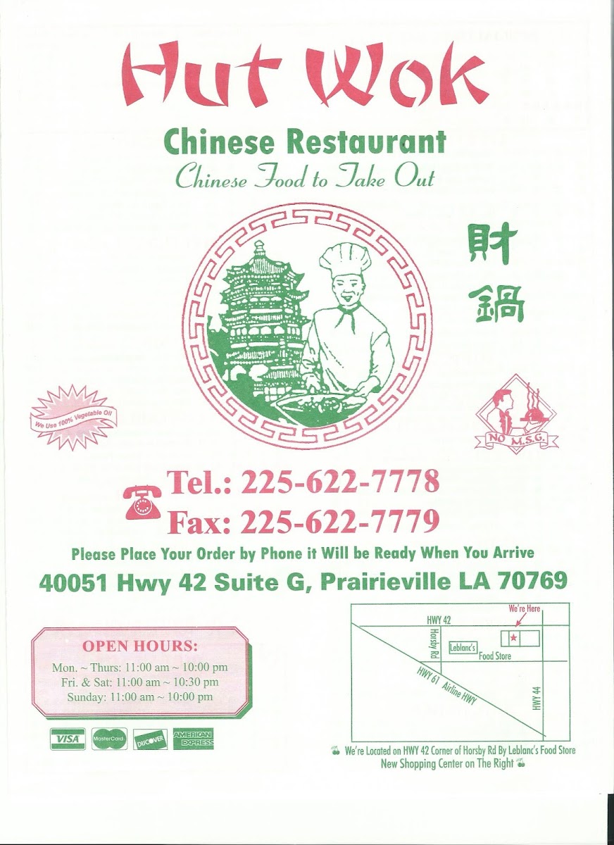 Always consistently delicious food! Very kind workers. We’ve been ordering takeout from Hut Wok since we move to the area 13 years ago. Best American-Chinese food around! We love the general tso chicken with lo mein, sweet & sour pork, egg rolls and mandarin chicken!
