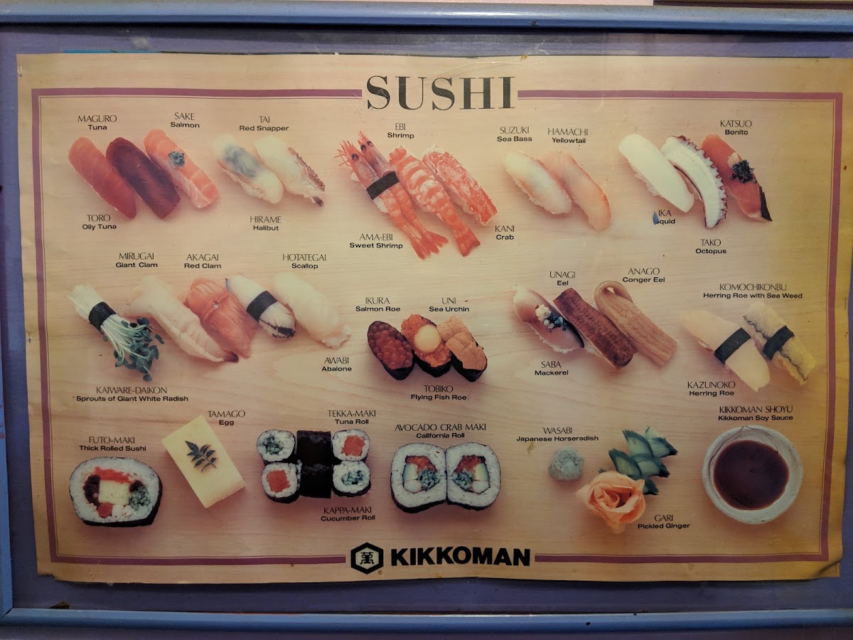 Crab stick, avocado, cucumber, seasame seeds, and masago.