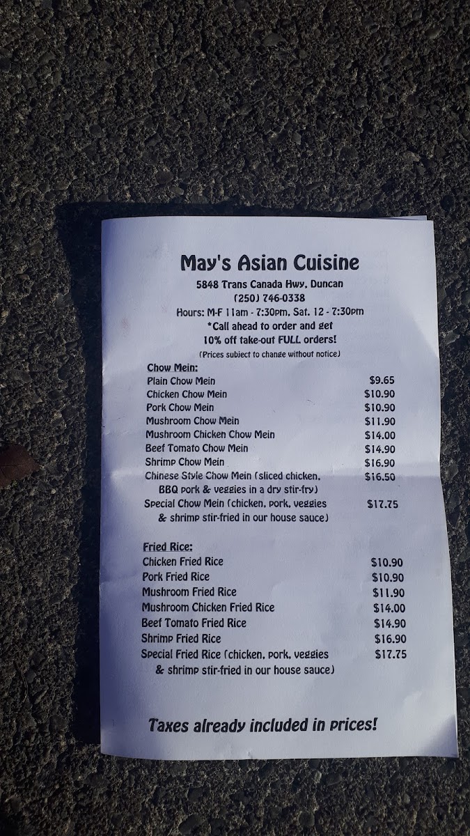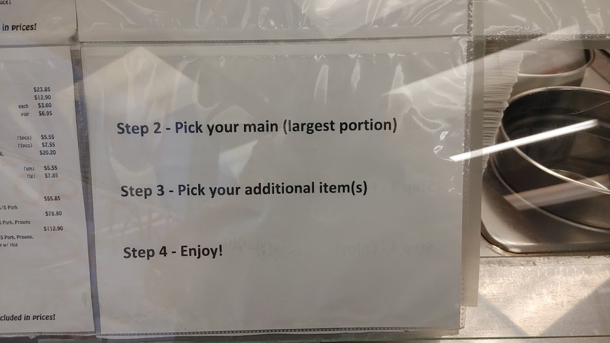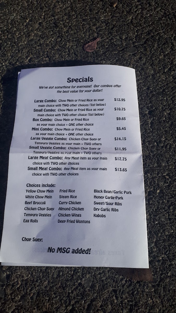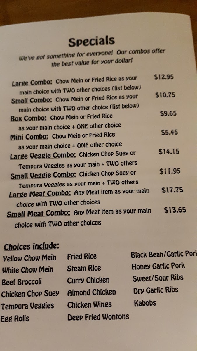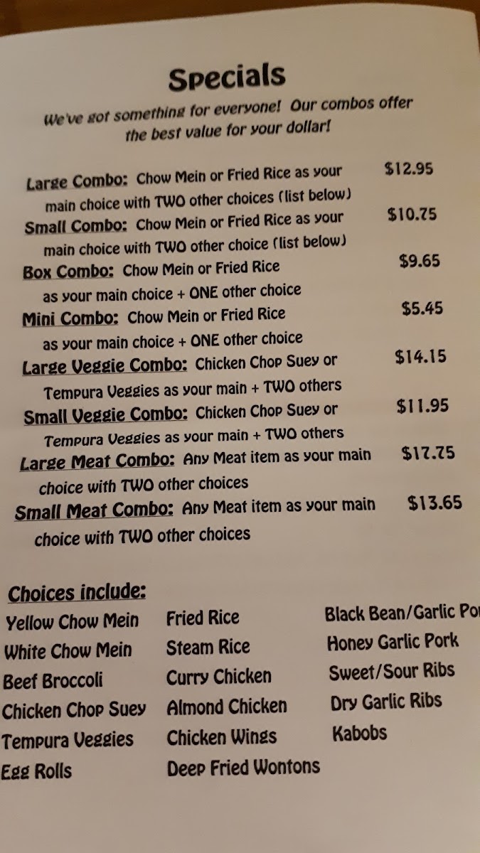 Chow mein or rice as your main choice and one other choice plus a juice box and either a lollipop or a fortune cookie. (If we're out of your selection of juice box or treat, we'll have to substitute with another that's available)