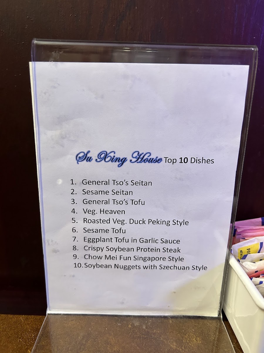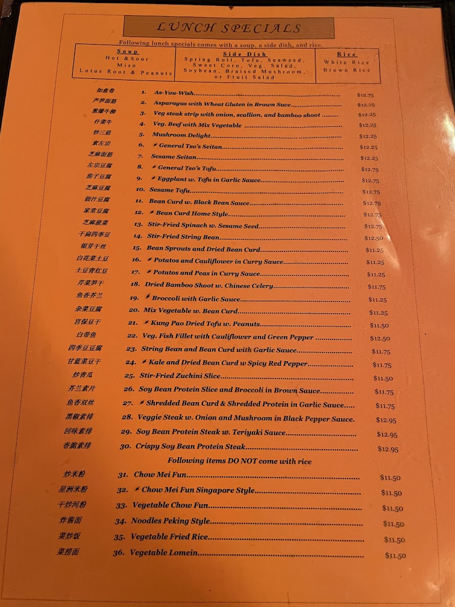 Mixed veggies and tofu in savory brown sauce. Served with choice of white rice, brown rice, or no rice. Options for sides include tea, soups, seaweed salad, corn, spring roll, or fruit cup.