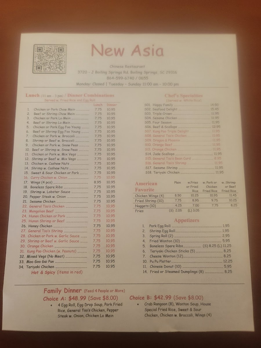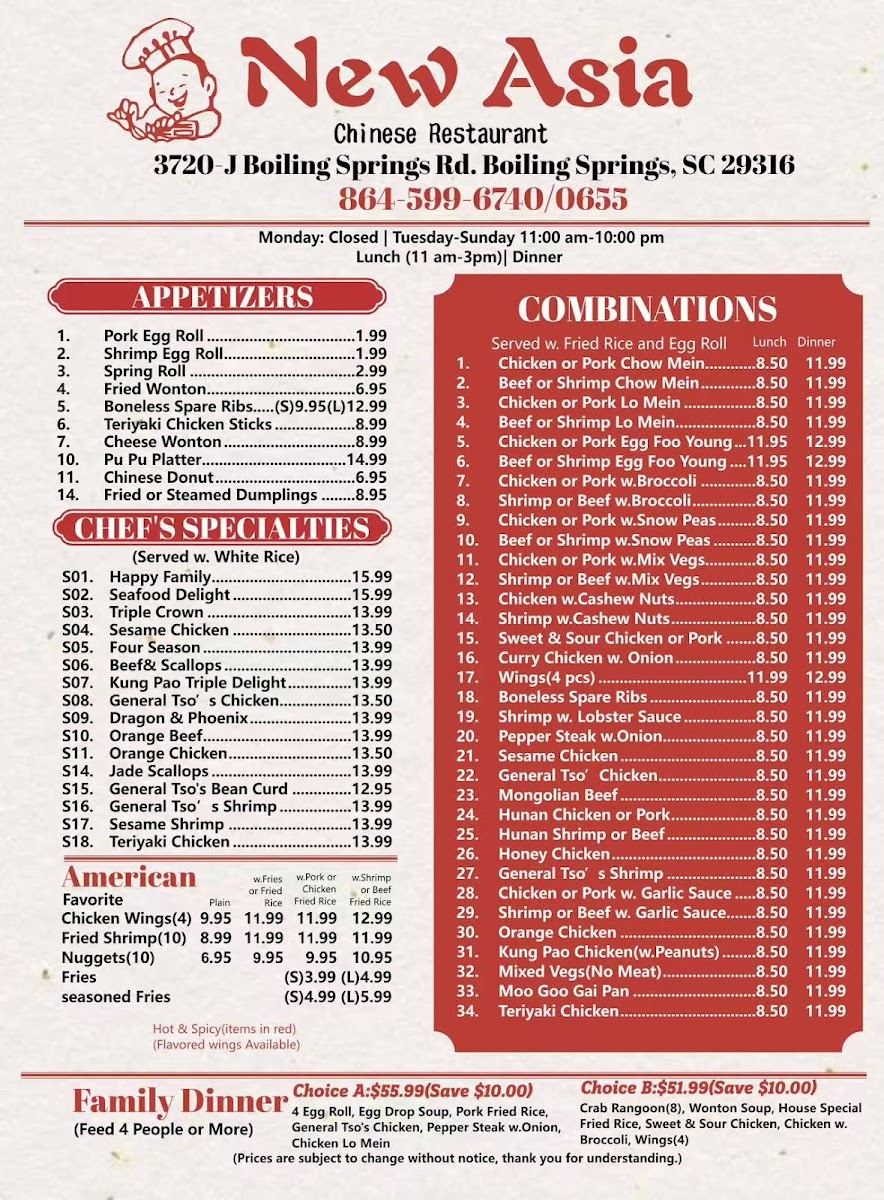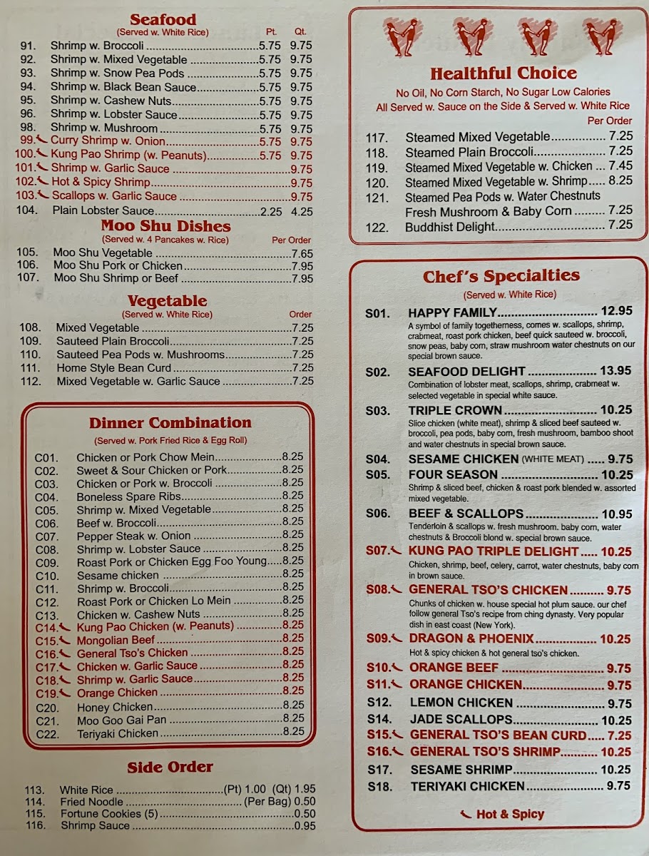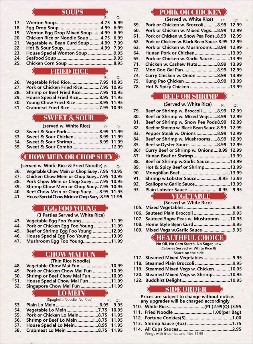 Includes 8-piece crab rangoons, large wonton soup, large house special fried rice, large sweet & sour chicken, large chicken w. broccoli, and 4-piece wings.