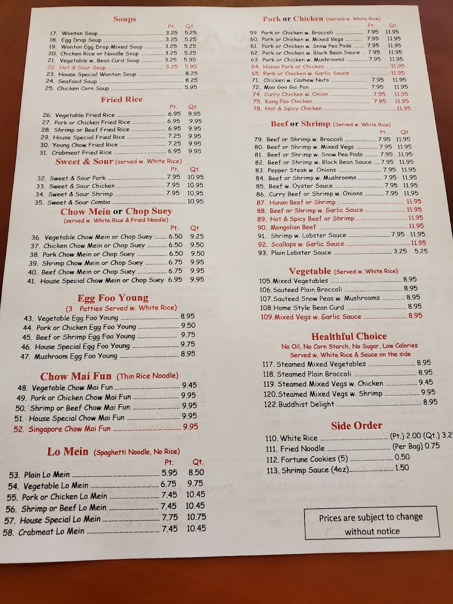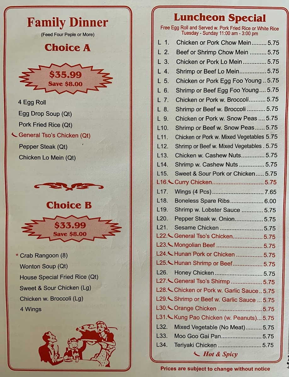 Includes 4 ggg rolls, large egg drop soup, large pork fried rice, large General Tso's chicken, large pepper steak with onion, and large chicken lo mein.