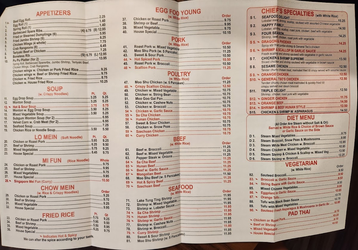 Spring rolls, barbecued spareribs, jumbo shrimp, teriyaki beef, chicken wings, crab rangoons.