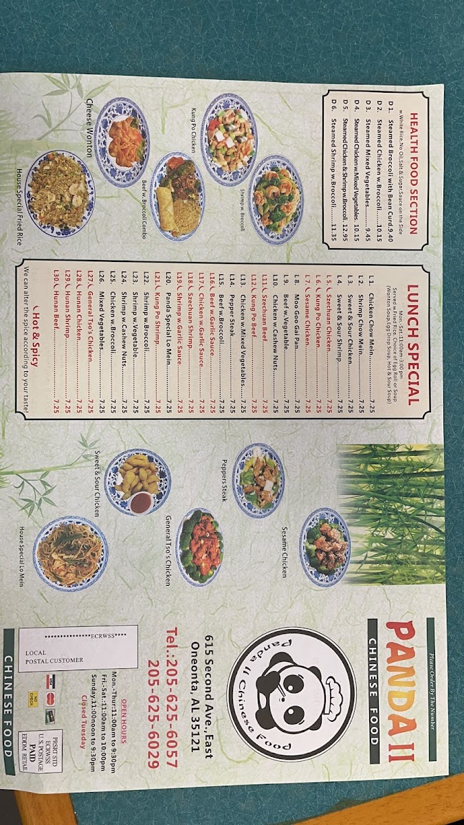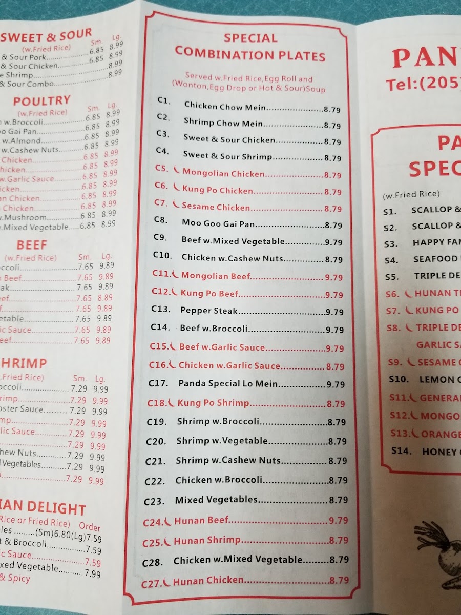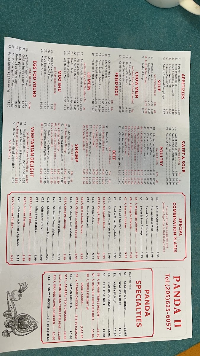 The Panda Special Egg Foo Young is a Chinese omelette that typically includes a mix of shrimp, chicken, and pork along with traditional vegetables such as bean sprouts, onions, and peas.