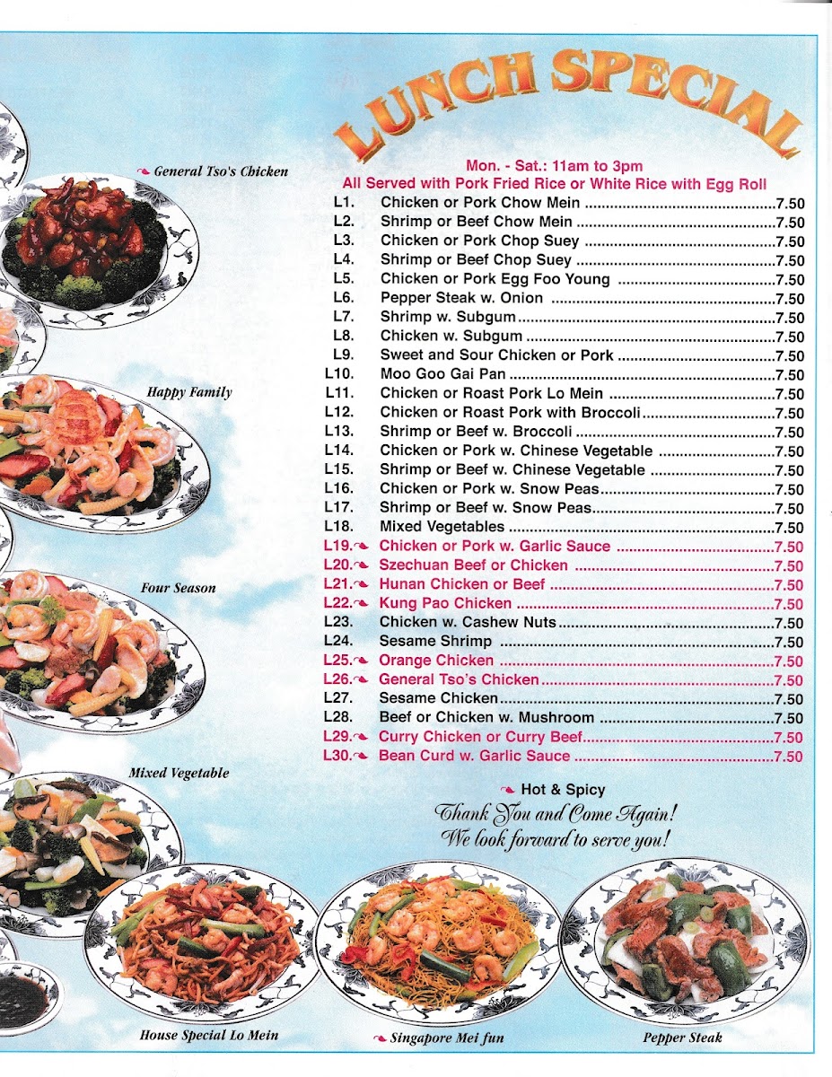 Chicken, pork, shrimp, scallop & crab meat w. mixed vegetables w. Peking sauce, served w. Fried wonton