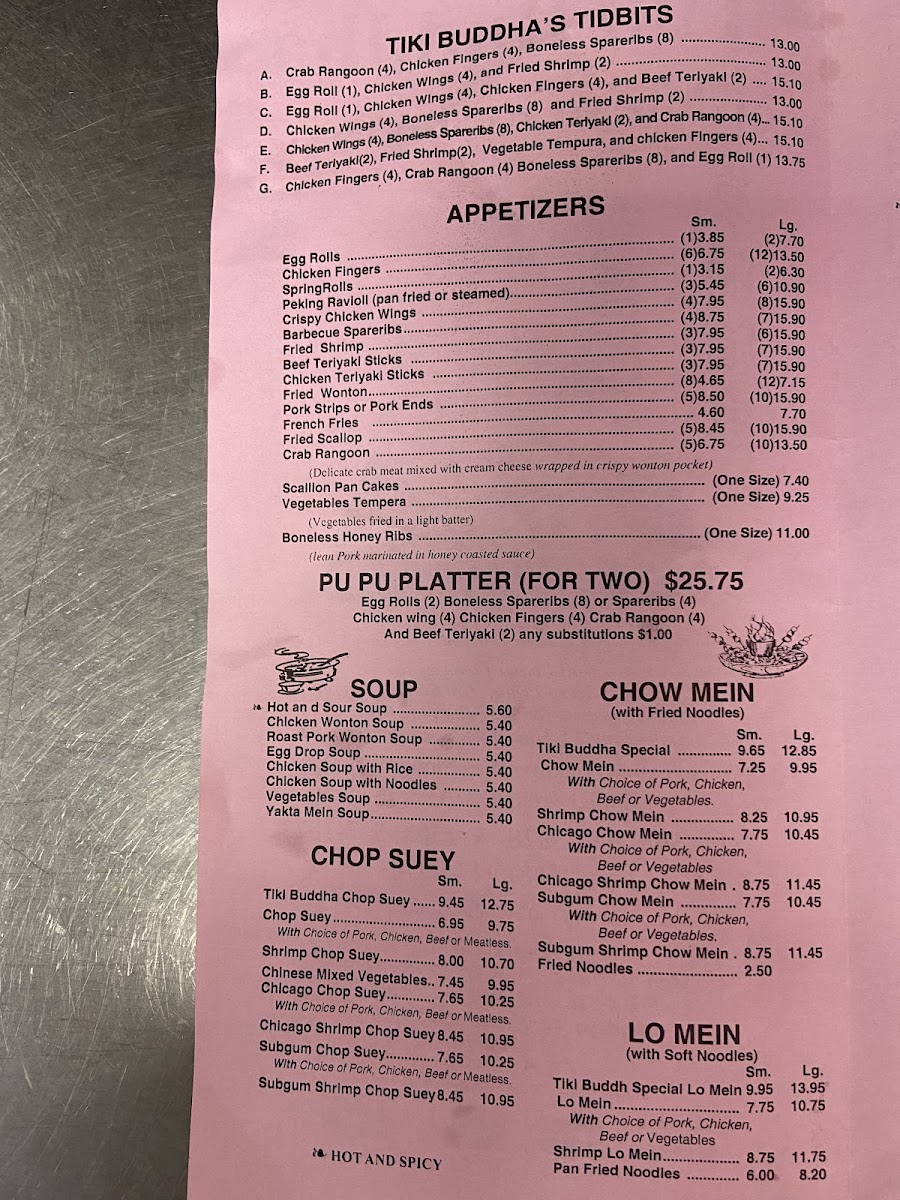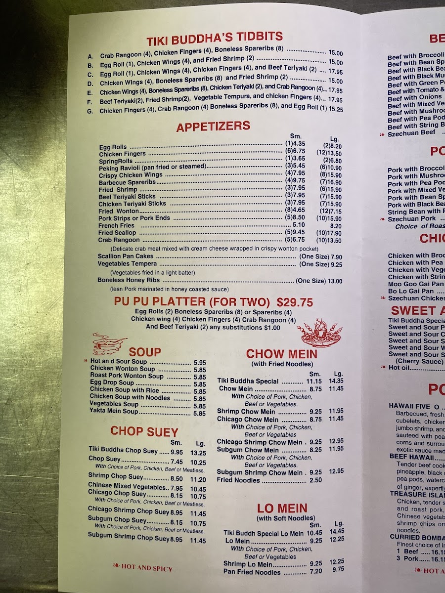 2 egg rolls, 8 boneless spare ribs or 4 spare ribs, 4 chicken wings, 4 chicken fingers, 4 crab Rangoon and 2 beef terlyakl.
