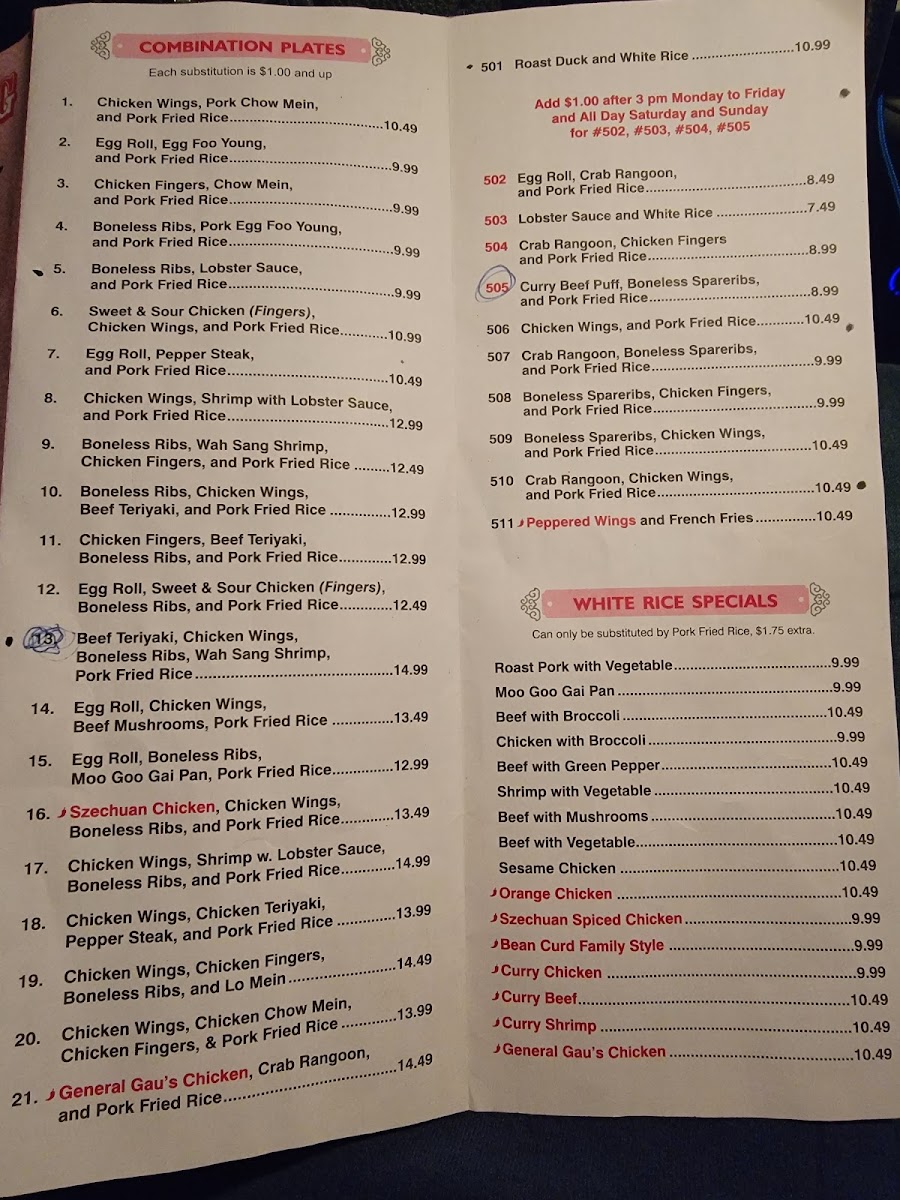 Chicken Fingers(5),Crab Rangoon(4),Boneless Ribs(6),Beef Teriyaki(2)