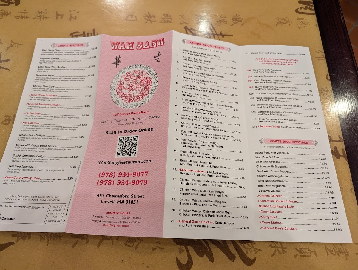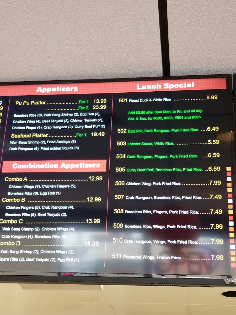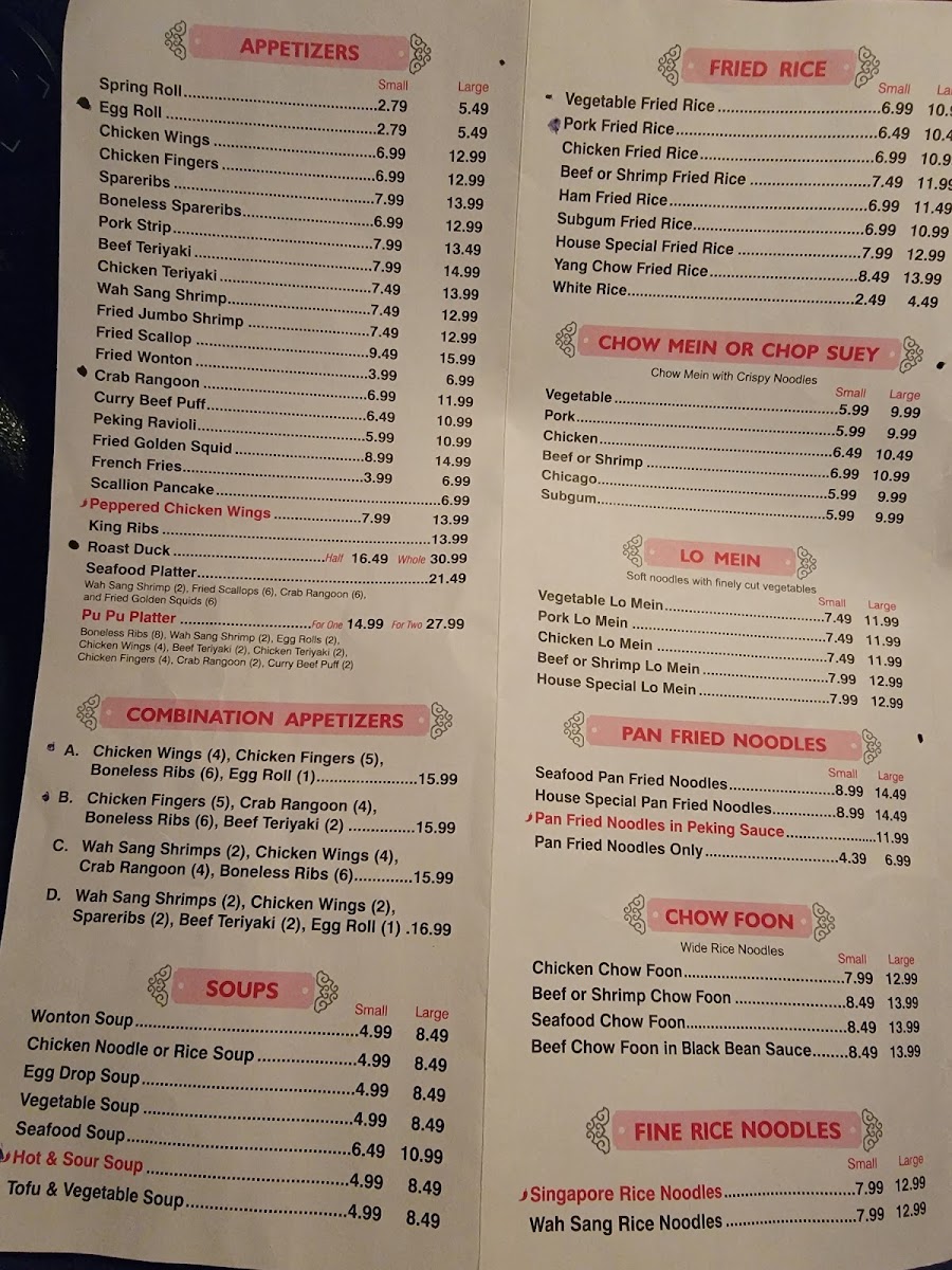 Wah Sang Shrimps(2),Chicken Wings(2)Crab Rangoon(4),Boneless Ribs(6)