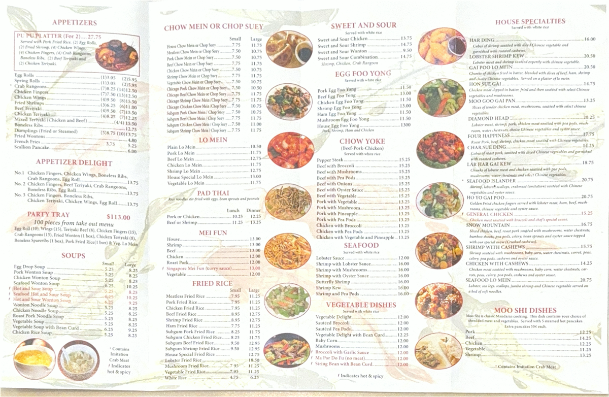 Pork Fried Rice (S), Egg Rolls (2), Fried Shrimps (2), Chicken Wings (4), Chicken Fingers (4), Crab Rangoons (4), Beef Teriyaki (2), Chicken Teriyaki (2), Boneless Ribs