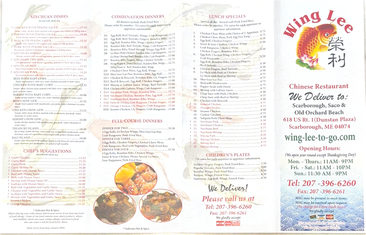 Egg Rolls (10), Chicken Wings (15), Beef Teriyaki (8), Chicken Teriyaki (8), Crab Rangoons (15), Chicken Fingers (15), Fried Wontons (1 Box), Boneless Ribs (1 Box), Pork Fried Rice (L), Veg. Lo Mein