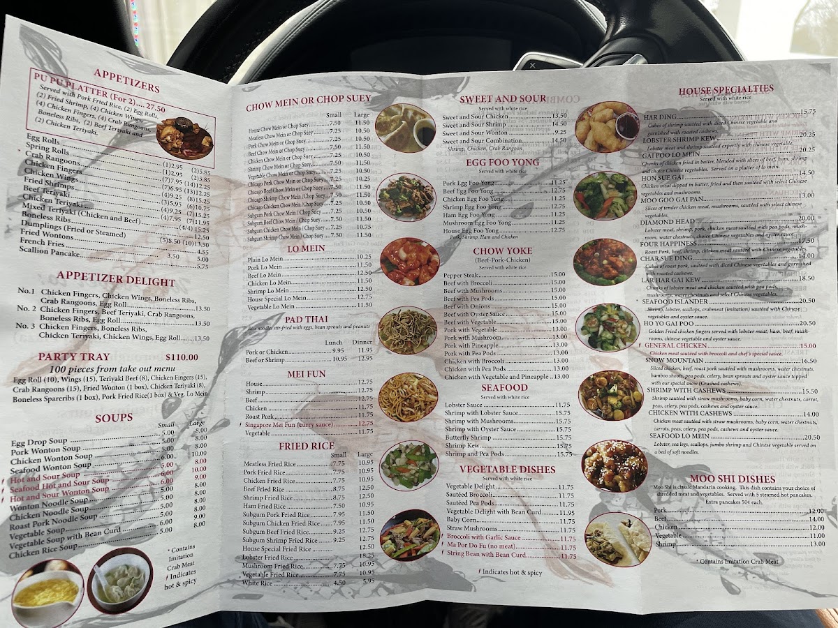Egg rolls (3), Chicken fingers, Chicken chow mein, Crab rangoons, Beef w/ Vegetables, and Pork fried rice.