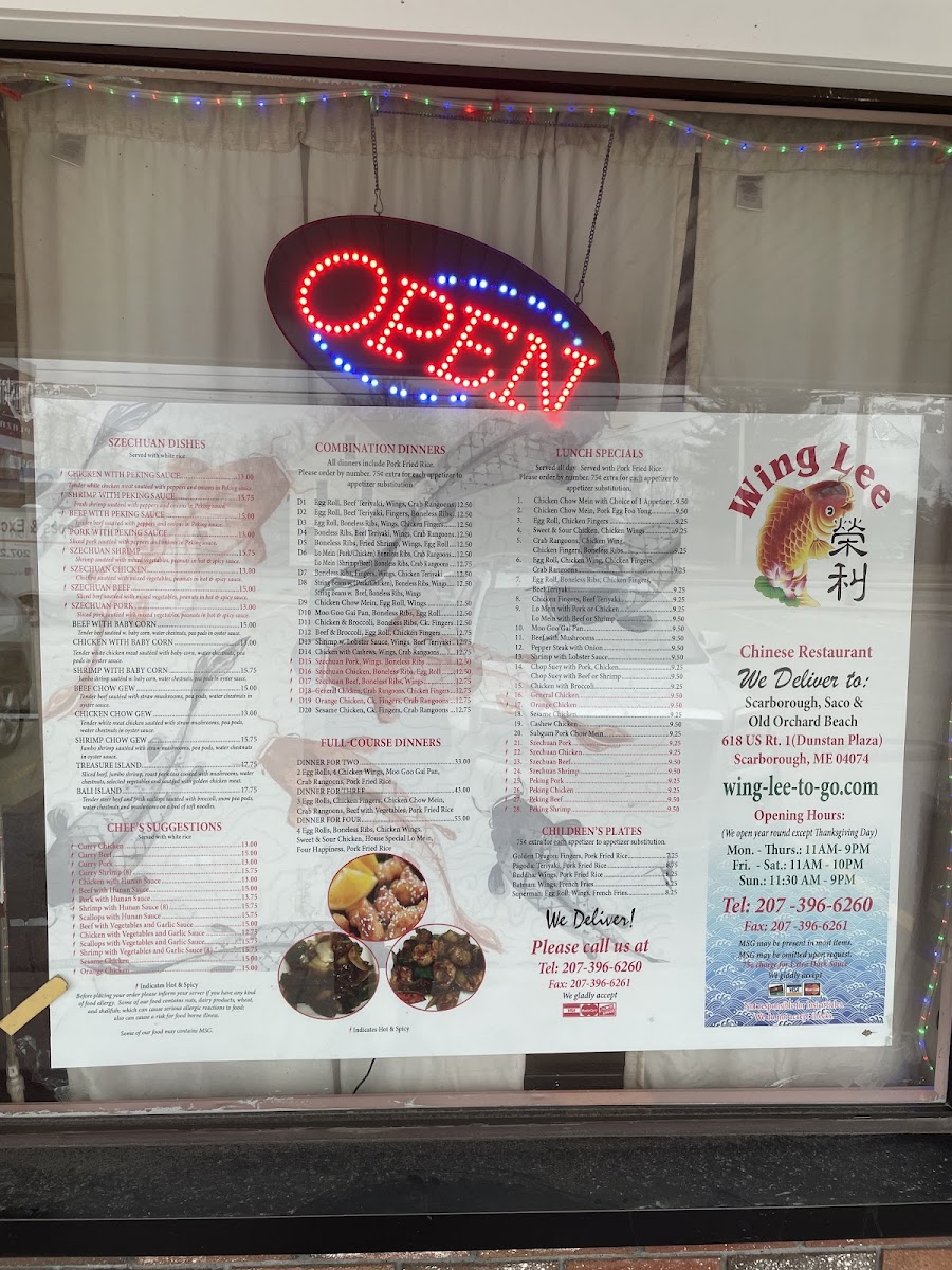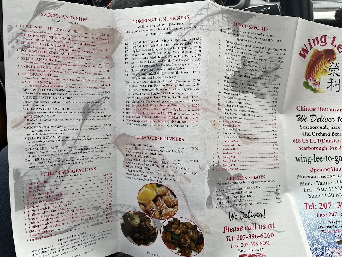 Egg rolls (2), Chicken wings (4), Moo Goo Gai Pan, Crab rangoons, and Pork fried rice.