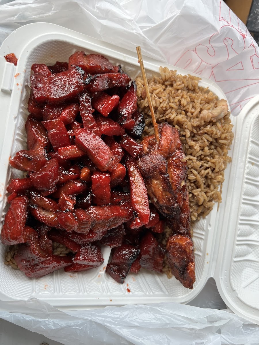 Great value for $12 they gave you a lot of boneless ribs with a side of rice and a chicken skewer, you could eat this 2-3 times with you cook some rice for it. The boneless ribs was good, got some fat to it but that’s where the flavor is. Not tender or dry so it’s average. Skewer was slightly dry and salty, not too much flavor to it. Rice was fine. 7/10