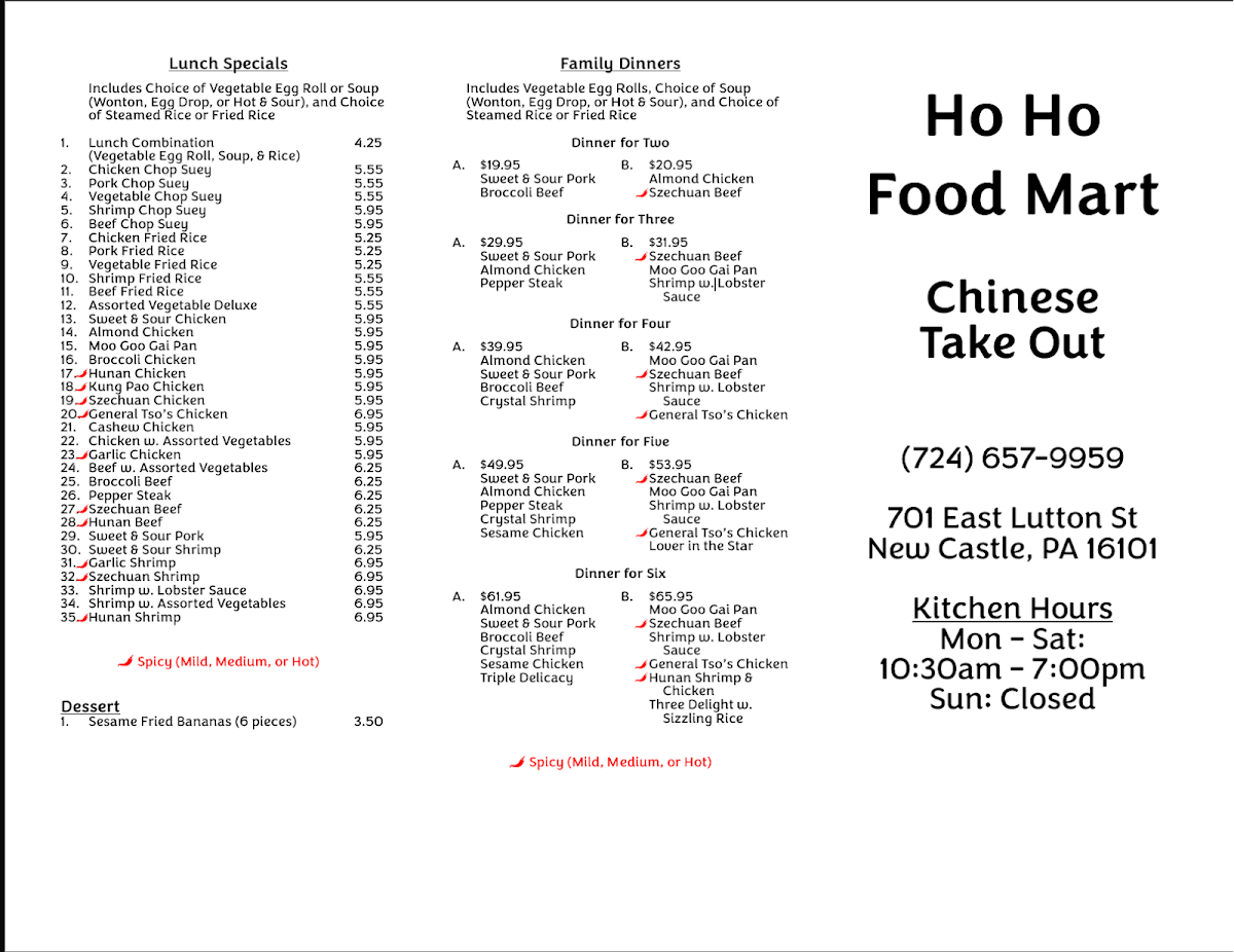 Ho Ho Food Mart is located at 701 E Lutton St, New Castle, PA 16101, United States, characterized as a Chinese Takeaway with 56 reviews. It experiences peak wait times of up to 15 minutes on Tuesdays from 3:30 PM to 6:00 PM, Wednesdays from 11:00 AM to 1:30 PM, Fridays from 11:30 AM to 2:30 PM, and Saturdays from 11:00 AM to 1:30 PM, while Thursdays and Sundays typically have no wait. Popular items include Sesame Fried Bananas, Bag of Fried Noodles, Quart and Pint sizes of Steamed or Fried Rice, and Dinner for Six (B), catering well to takeout customers during busy meal periods throughout the week.