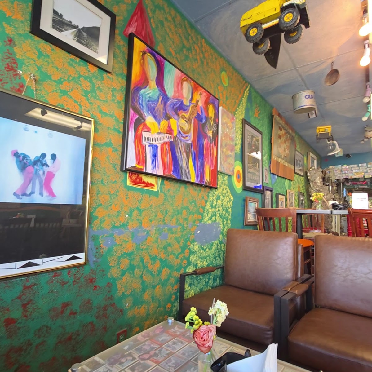 We waited a long time for our food, delayed by a local coming in after us and getting their food first :/ Food was alright, not being great with the bagels being kind of chewy. The inside was covered in decorations which I enjoyed, but LOVED the Volkswagen type 2 light on the outside. Creepy octopus painted onto the roof of the bathroom.